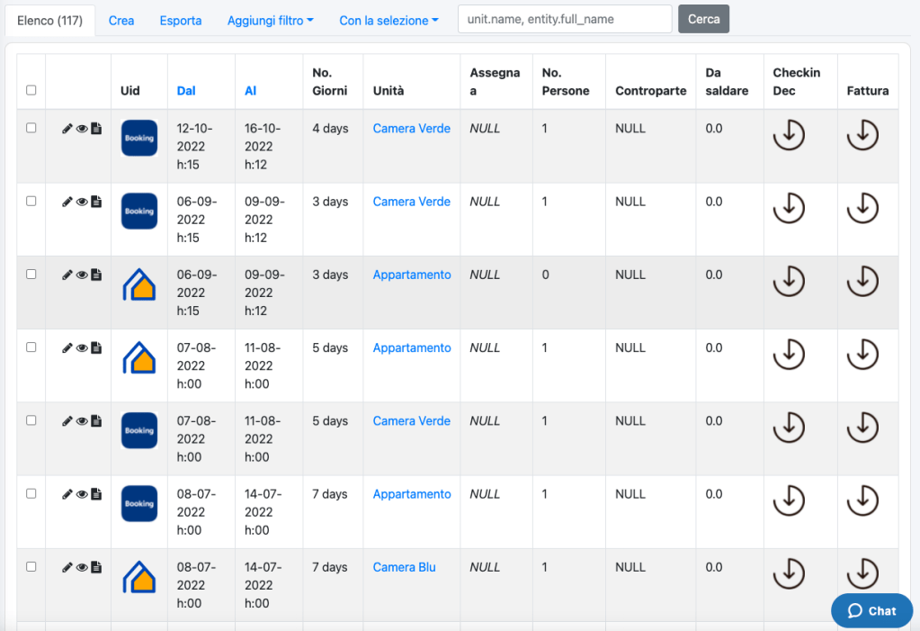 Navigando dal menù a tendina sulla voce Prenotazioni Brevi è possibile accedere alla schermata completa delle prenotazioni che include sia quelle dirette (effettuate sul proprio sito web) che quelle indirette (effettuate su portali partner quali Booking.com oppure AirBnB.com). Questo avviene a condizione che le unità/camere delle strutture vengano correttamente impostate nel sistema agganciando in maniera opportuna i calendari di sincronizzazione (si consiglia la lettura dell’articolo sul blog “Sincronicca e Gestisci i tuoi calendari”). Di seguito un esempio di schermata delle prenotazioni.